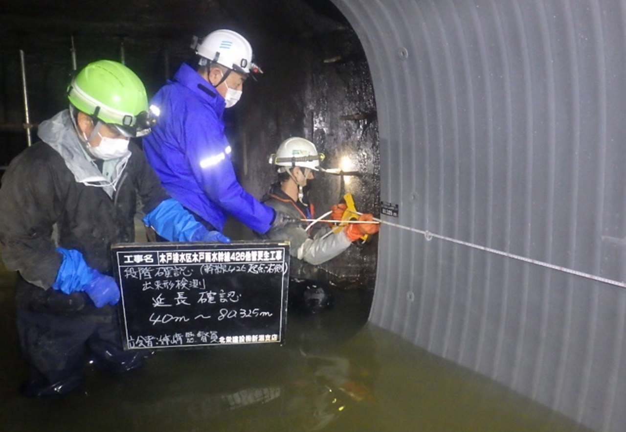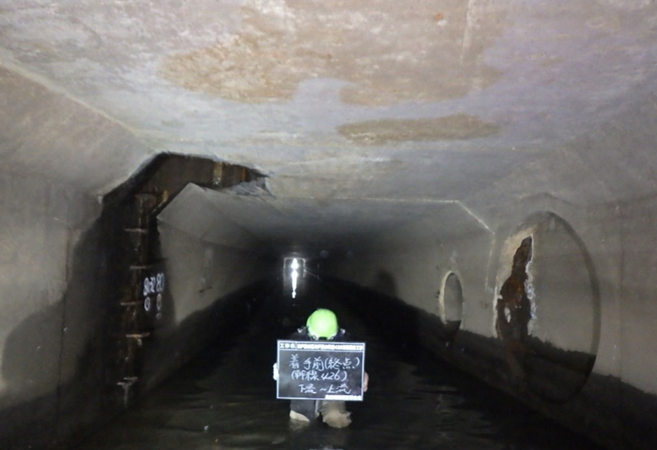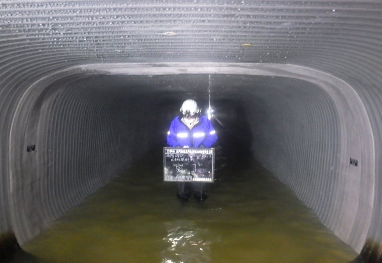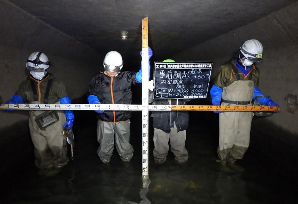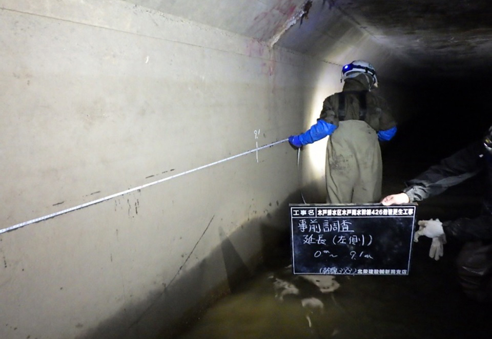 なので、既設管の施工延長や内空断面を測定し、作業に支障となる異常個所がないかを調査します。