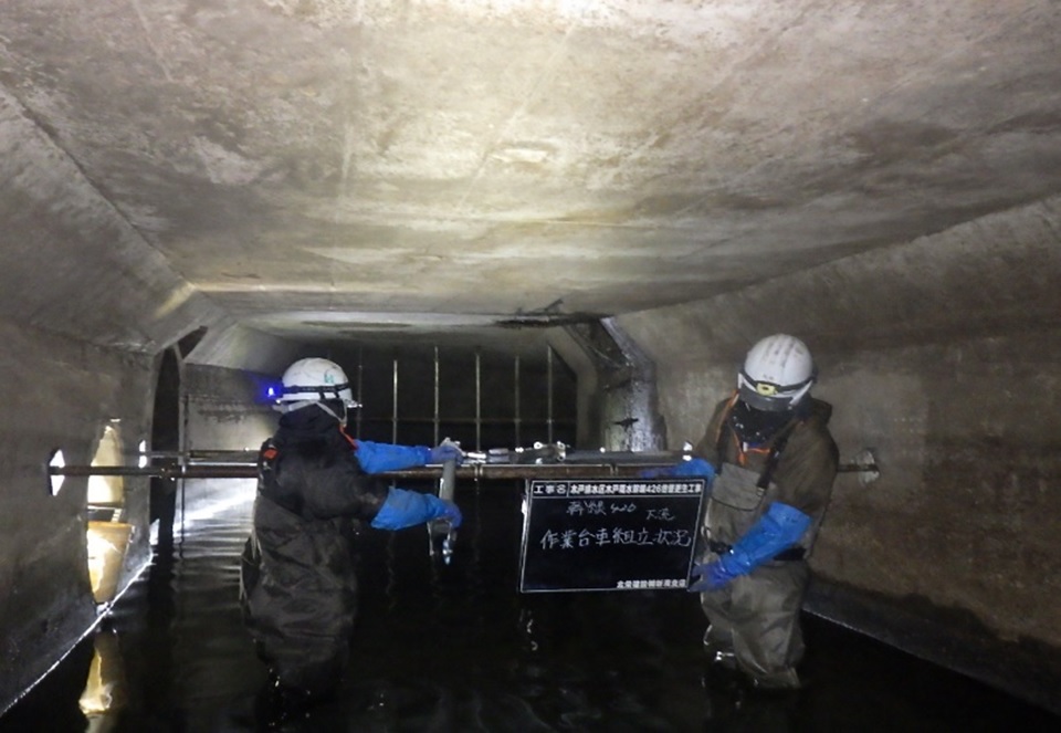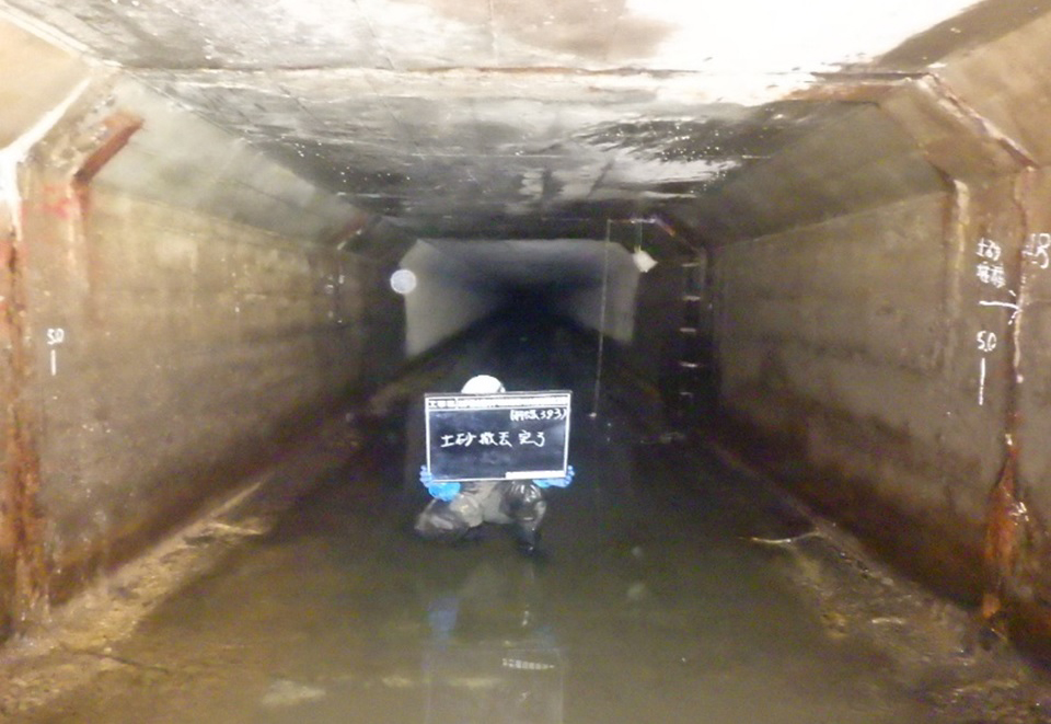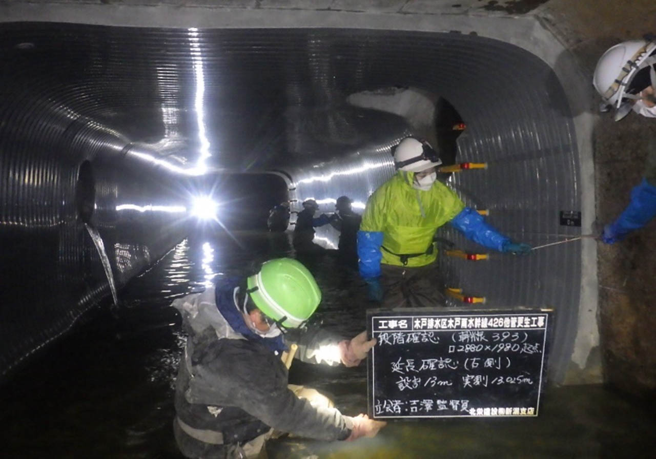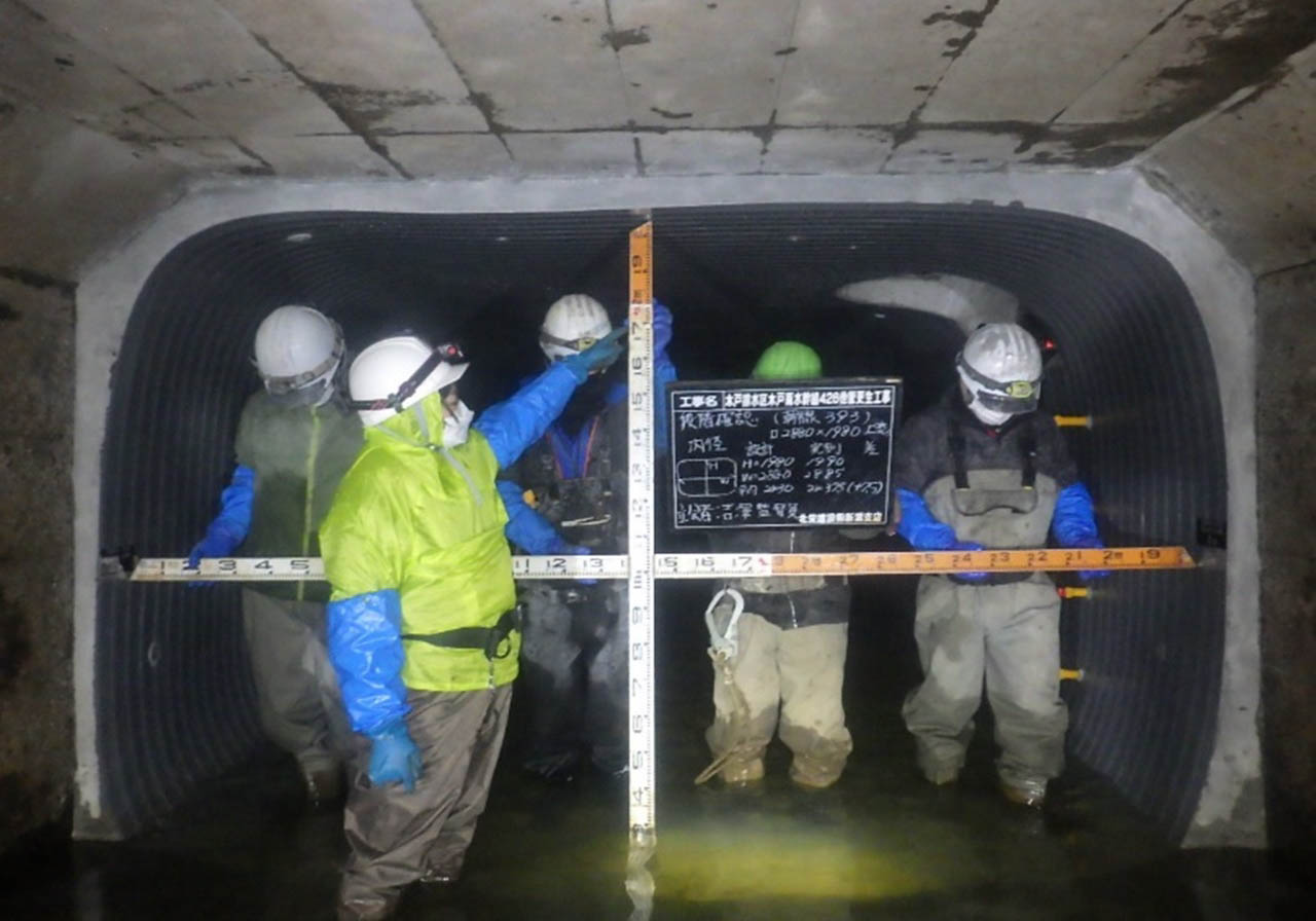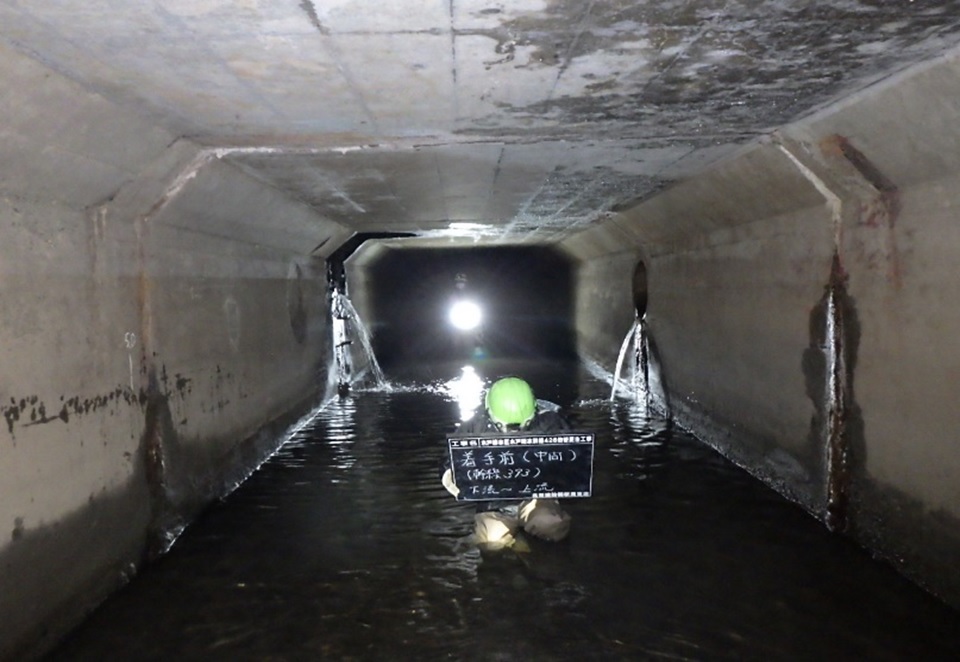 なので、既設管の施工延長や内空断面を測定し、作業に支障となる異常個所がないかを調査します。