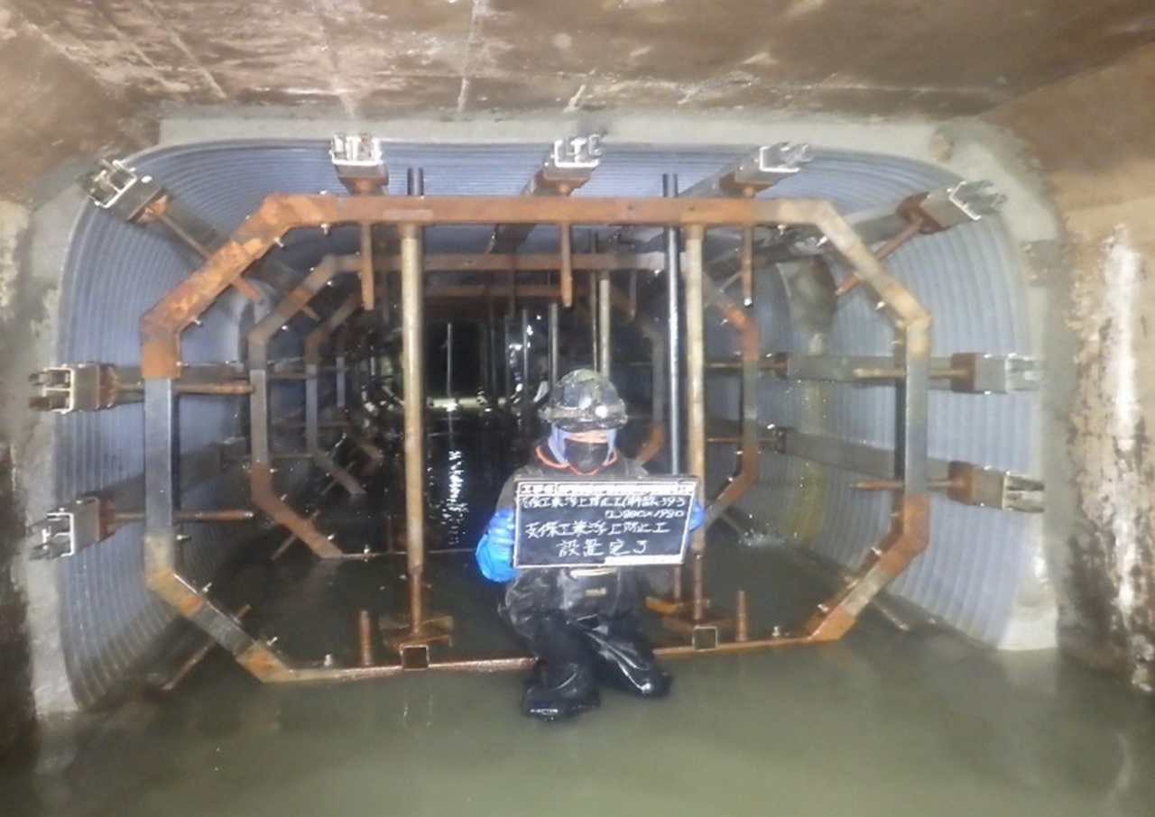モルタルの圧力による更生管の浮き上がりや変形するのを防ぐための作業です。