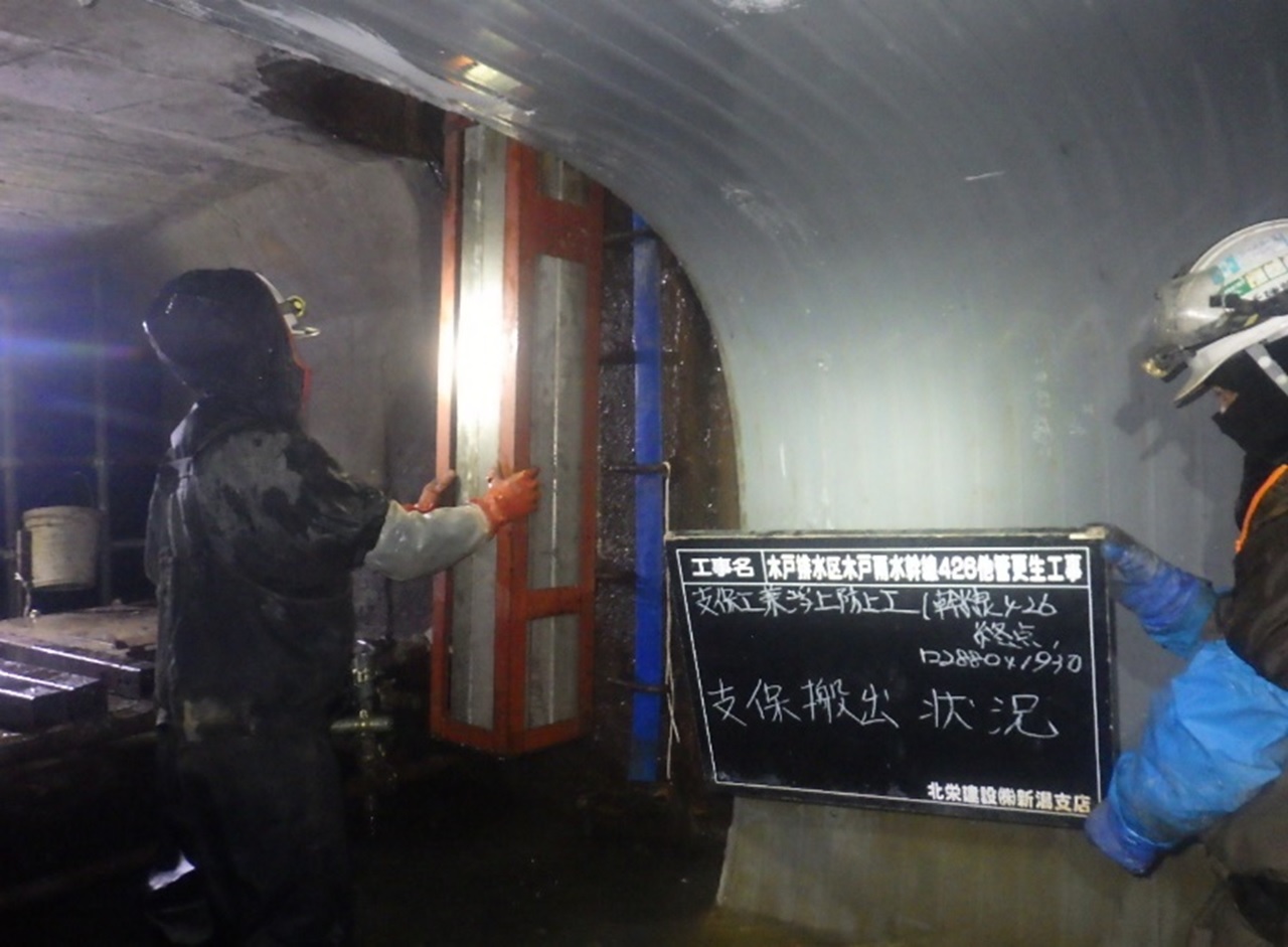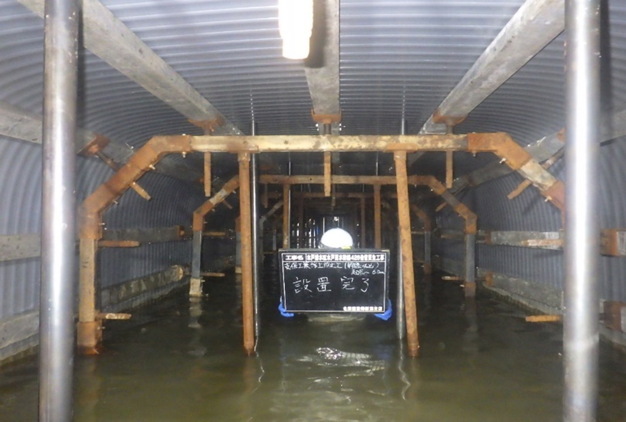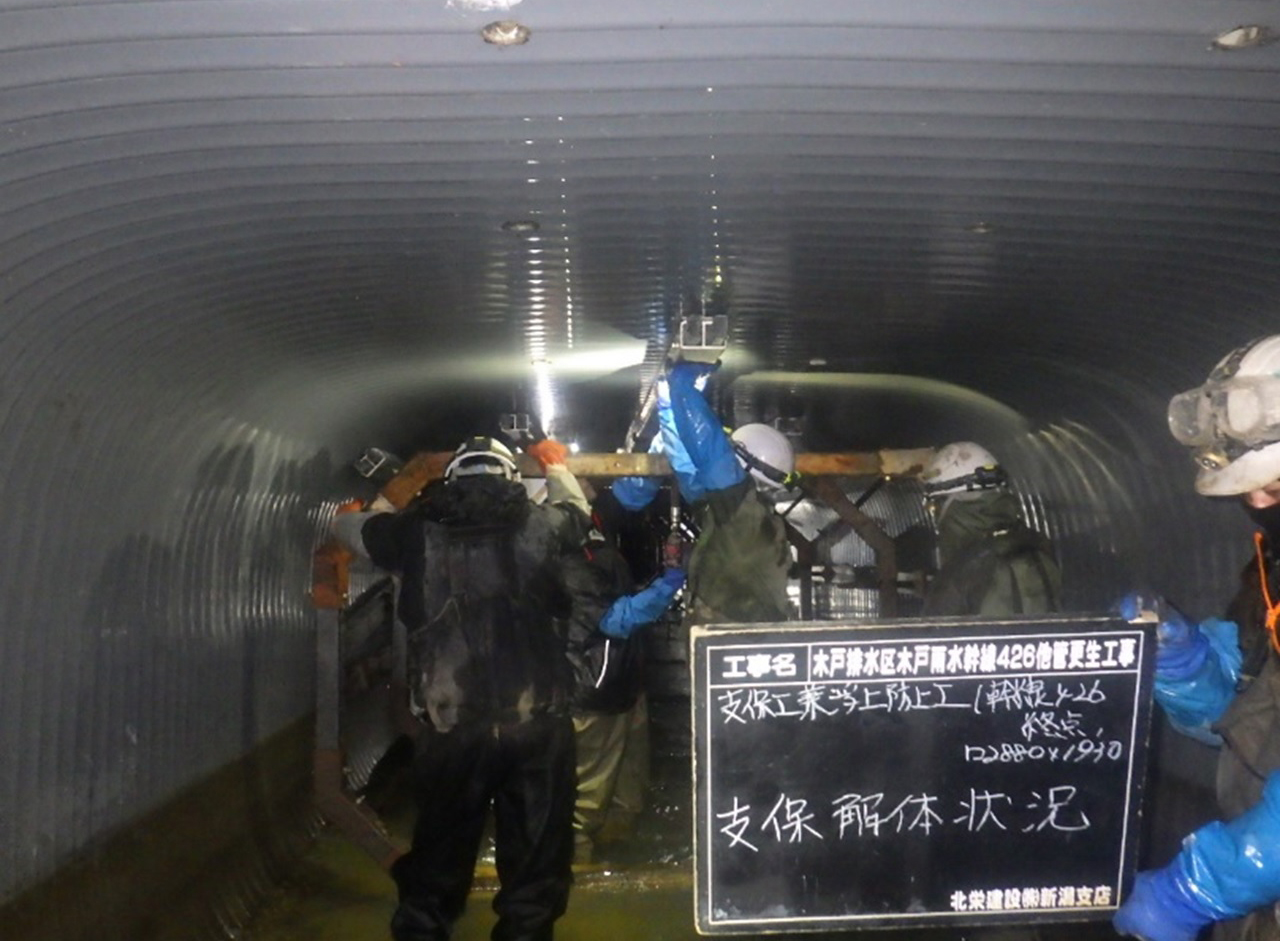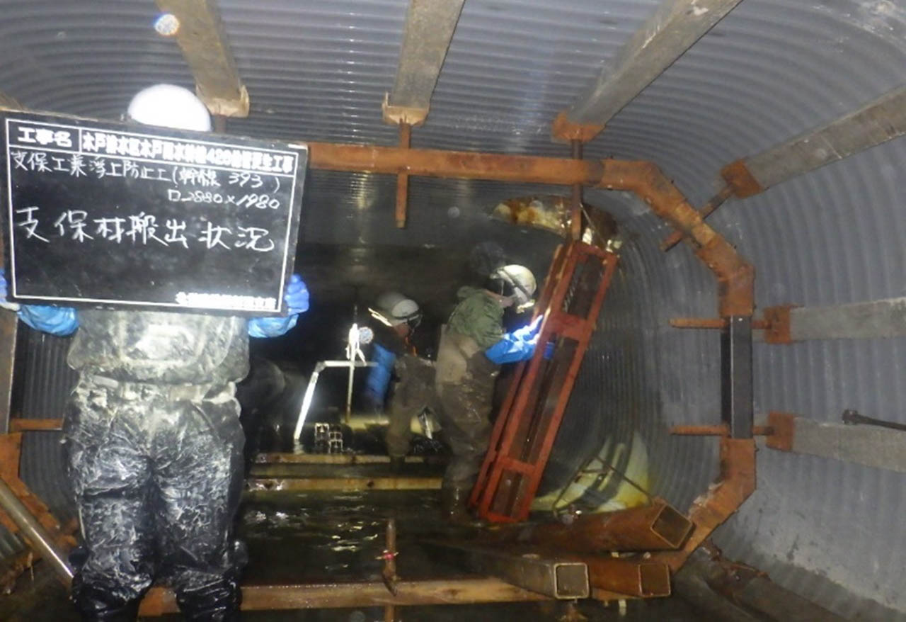 更生管の浮き上がりや変形を防ぐために設置していた腹起しと金属製リングを解体・撤去します。